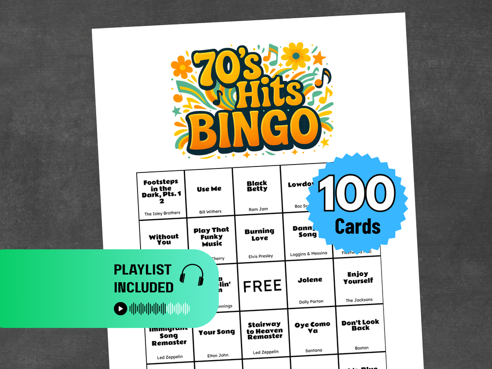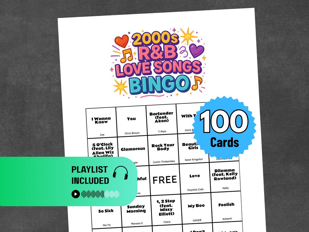 Paste a Spotify URL from a playlist, name your game, and choose the number of cards. It's that easy! After checkout, we'll automatically generate your custom game for you download and play!